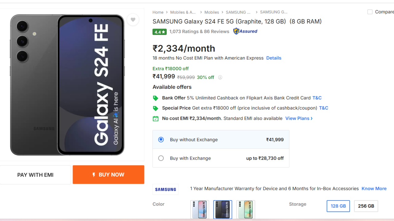The Samsung Galaxy S24 FE 5G is now available with a massive discount. The real price of the phone is ₹59,999, but you can grab it now for just ₹41,999 with a flat ₹18,000 off. That’s not all, if you exchange your old smartphone, you can get an additional discount of up to ₹30,230, depending on your phone’s condition and model. This brings the effective price even lower. So, with the flat rate and exchange offer combined, you’re getting a premium 5G phone at a surprisingly affordable deal perfect for the wedding season or even as a personal upgrade.