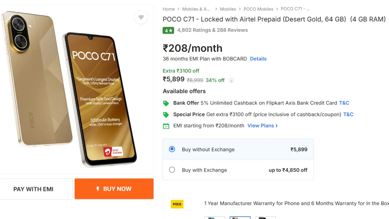 Poco C71 Discount : If you wish to buy a new phone without digging a hole in your pocket, then you can make your day great with this offer. Flipkart is now offering a whoping discount on Poco C71. The phone is now available at a price of only ₹5,899. Launch price is ₹8,999, which means you are getting 34 percent flat discount. There’s more to it. You also get an exchange offer of ₹5,100. You can save even more if you are exchanging the phone which you are using at present.