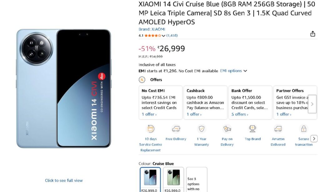 At a starting price of Rs 42,999, the Xiaomi 14 Civi was launched in India. The Xiaomi 14 Civi is now priced at Rs 26,999 due to a flat discount of Rs 16,000 offered by Amazon. Also, DBS Bank and Scapia Federal Bank credit card EMI transactions are eligible for an extra discount of Rs 1,500.