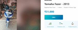 आपको बता दें कि यह बाइक Quikr पर मात्र 31,000 रुपये में उपलब्ध है, जो कि काफी किफायती डील है। यह 2013 मॉडल की Yamaha Fazer है, जो अब तक सिर्फ 60,000 किलोमीटर चली है। सबसे खास बात यह है कि बाइक की स्थिति बेहद अच्छी है और इसमें कोई तकनीकी खराबी नहीं है। अगर आप इसे खरीदना चाहते हैं, तो आज ही Quikr वेबसाइट पर विजिट करें।
