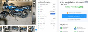 Second Hand Bajaj Platina 110 एक शानदार और किफायती बाइक है। इस बाइक को लोगों ने काफी पसंद किया है। चाहे गाँव हो या शहर, यह बाइक हर जगह देखने को मिलती है। इसमें शानदार माइलेज मिलता है, जो लंबी दूरी तय करने वालों के लिए बेहद फायदेमंद है। अगर आप इसे खरीदने की सोच रहे हैं तो आपके लिए एक अच्छी खबर है । अब यह बाइक बेहद कम कीमत में मिल रही है। यदि आपका बजट कम है, तो आप इसे ऑनलाइन मार्केट से भी खरीद सकते हैं। तो आइए जानते हैं कि इसे सस्ते में कहाँ से खरीदा जा सकता है।