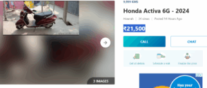 यह स्कूटर अब Quikr वेबसाइट पर काफी कम कीमत में उपलब्ध है। Quikr एक ऑनलाइन प्लेटफॉर्म है जहां सेकंड हैंड बाइक (second hand bike), स्कूटर और कारें बेची जाती हैं। यहां Honda Activa 6G को सिर्फ ₹21,500 में लिस्ट किया गया है। यह 2024 मॉडल है और अब तक सिर्फ 9,999 किलोमीटर चली है। अगर आप इसे खरीदना चाहते हैं, तो Quikr पर जाकर पूरी जानकारी ले सकते हैं।