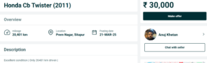 Honda CB Twister बाइक काफी पॉपुलर है। इसकी लुक और डिज़ाइन शानदार हैं। अगर आप कम कीमत में एक दमदार बाइक खरीदने की सोच रहे हैं, तो Honda CB Twister आपके लिए बेस्ट ऑप्शन हो सकता है। अगर आपका बजट कम है, तो इस बाइक को सेकंड हैंड ऑनलाइन मार्केट से खरीद सकते हैं। यह बाइक सेकंड हैंड होने के बावजूद अच्छी कंडीशन में है। आइए जानते हैं इसके बारे में विस्तार से।