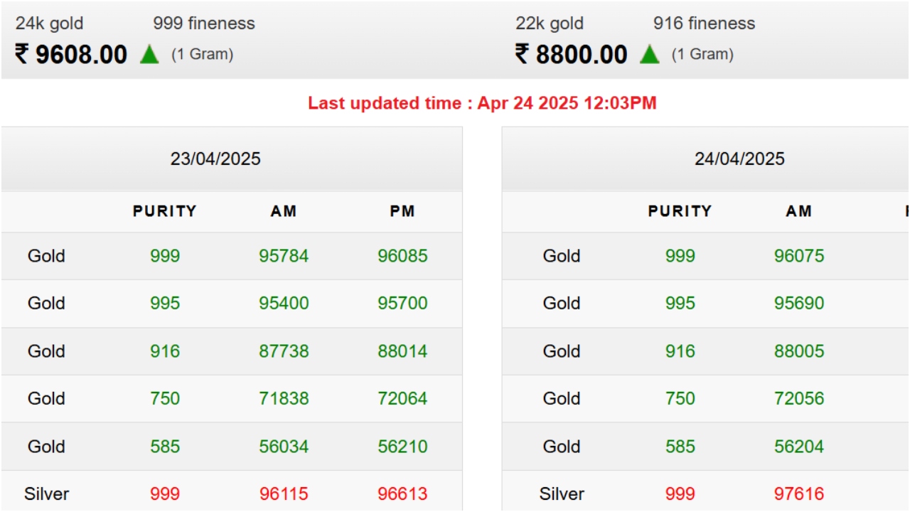 इसके साथ ही 916 प्योरिटी (22 कैरेट) वाले गोल्ड का प्राइस (gold price) कम होकर 88005 रुपये प्रति तोला पर बिकता दिखा. 750 प्योरिटी वाले गोल्ड का रेट (gold price) घटकर 72056 रुपये प्रति तोला पर ट्रेंड करता नजर आया. 585 प्योरिटी यानी 14 कैरेट वाले सोने की कीमत कम होकर 56204 रुपये प्रति तोला रह गई.