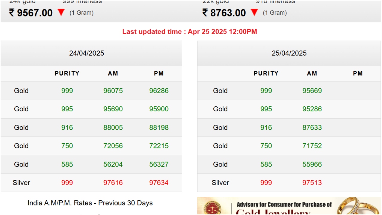 इसके साथ ही 916 प्योरिटी यानी 22 कैरेट वाले गोल्ड का रेट (gold price) कम होकर 87633 रुपये प्रति तोला पर ट्रेंड करता दिखा. वहीं, मार्केट में 750 प्योरिटी यानी 18 कैरेट वाले गोल्ड का रेट घटकर 71752 रुपये प्रति दस ग्राम पर दर्ज किया गया. 585 प्योरिटी वाले सोने का प्राइस 55966 रुपये प्रति तोला पर ट्रेंड करता दिखा.