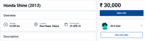 अगर आपके पास बजट कम है, तो आप Honda Shine को ऑनलाइन मार्केट से खरीद सकते हैं। यह बाइक OLX पर लिस्टेड है, और इसकी कीमत मात्र 30,000 रुपये रखी गई है। बाइक की कंडीशन भी काफी अच्छी है। अब तक यह बाइक केवल 22,500 किलोमीटर चली है। अगर आप इसे खरीदना चाहते हैं, तो OLX वेबसाइट पर जाकर इस ऑफर का लाभ उठा सकते हैं।