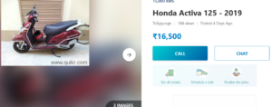 तो आपको बताते हैं कि सबसे पहले तो आपको क्विकर वेबसाइट पर जाना है और इस स्कूटी को सर्च करना है। सर्च करने के बाद स्क्रीन में आपको कॉल और चैट का ऑप्शन देखने को मिलेगा, अब आप इसके जरिए ओनर से बात करके इसे ले सकते हैं।
