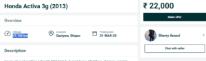 अगर आपके पास कम पैसे हैं, तो आप इस स्कूटर को OLX पर जाकर खरीद सकते हैं। जी हाँ, यह स्कूटर OLX पर लिस्टेड है और मात्र 22 हजार रुपये में उपलब्ध है। यह स्कूटर 2013 मॉडल है और अब तक 47,156 किमी चला है। स्कूटर की कंडीशन भी अच्छी है। इसके अलावा, इस स्कूटी में आपको शानदार माइलेज भी मिलता है। अगर आप इसे खरीदना चाहते हैं, तो आज ही OLX पर जाएं।