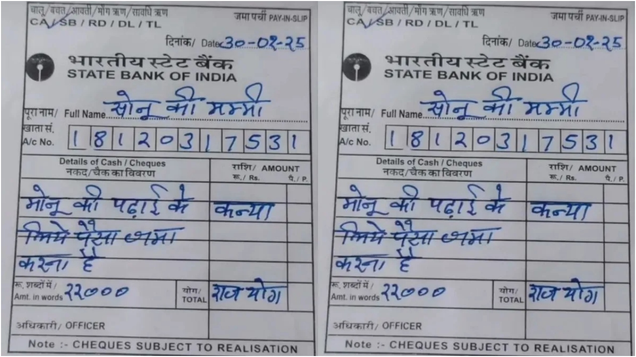 सबसे चौंकाने वाली बात यह है कि उसने रसीद पर मांगे गए विवरण की जगह मोनू की पढ़ाई के लिए जमा करना पड़ेगा. राशि को शब्दों में “बाईस हजार” के रूप में लिखा गया है. योग यानी की Total की जगह शख्स ने “राजयोग” लिखा है. बैंक की यह रसीद सोशल मीडिया पर वायरल हो रही है.