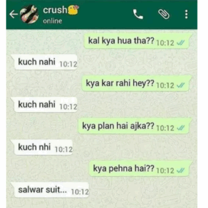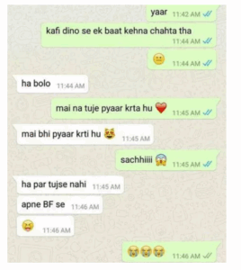 सोशल मीडिया खासकर व्हाट्सएप ने प्यार की नई मिसाल को जन्म दिया है। किसी भी लड़के या लड़की के दिल में क्या चल रहा है, यह जानना बेहद आसान हो गया है। ऊपर दी गई तस्वीर में लड़के का इशारा किस की तरफ था, लड़की ने शायद इसे अच्छे से समझ लिया और उसने लड़के को उसकी ही भाषा में जवाब दिया और उसकी बोलती बंद कर दी। वैसे आपको बता दें कि कई मैसेज डबल मीनिंग वाले होते हैं। ऐसे में यह आप पर निर्भर करता है कि आप किस मैसेज को किस नजरिए से देखना चाहते हैं।