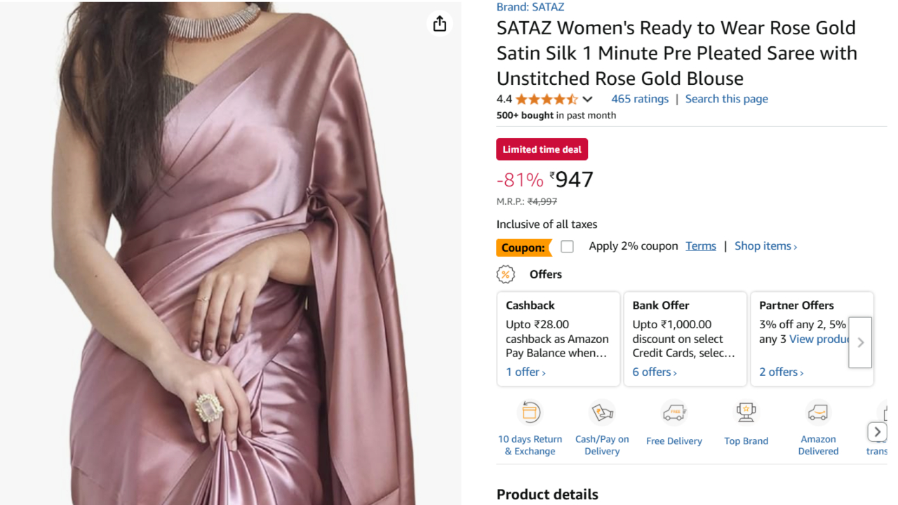 This SATAZ Women’s Ready to Wear Rose Gold Satin Silk 1-Minute Pre-Pleated Saree is exactly what you needed. Its staggering 81% off lowers this gorgeous beauty to your hands for the steal price of ₹947 (its original price: ₹4,997). And on top of this, use a 2% off discount coupon during check out to get an even greater bargain.