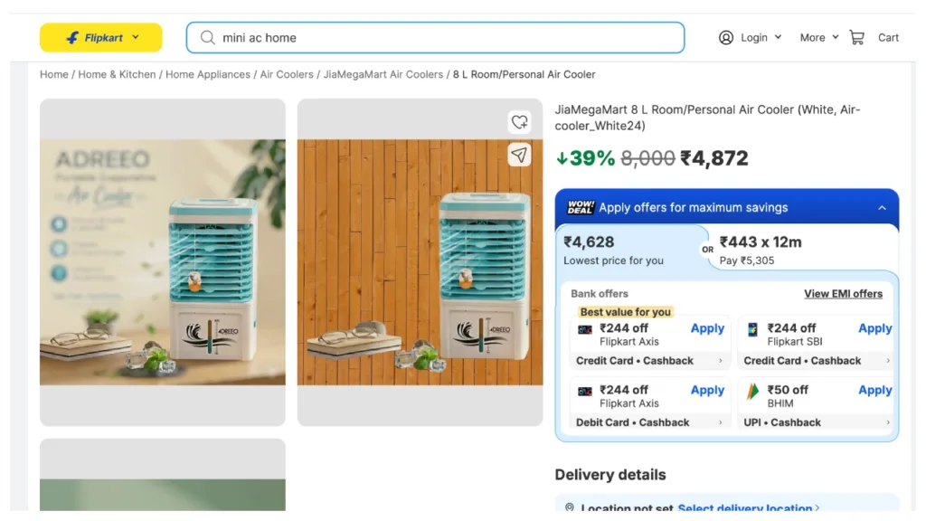 You can purchase this product directly from the Flipkart website. It is currently listed on Flipkart with a 39% discount, priced at ₹4,872. As for its operation, you can place and use it almost anywhere. You can even keep it in the kitchen while you cook.