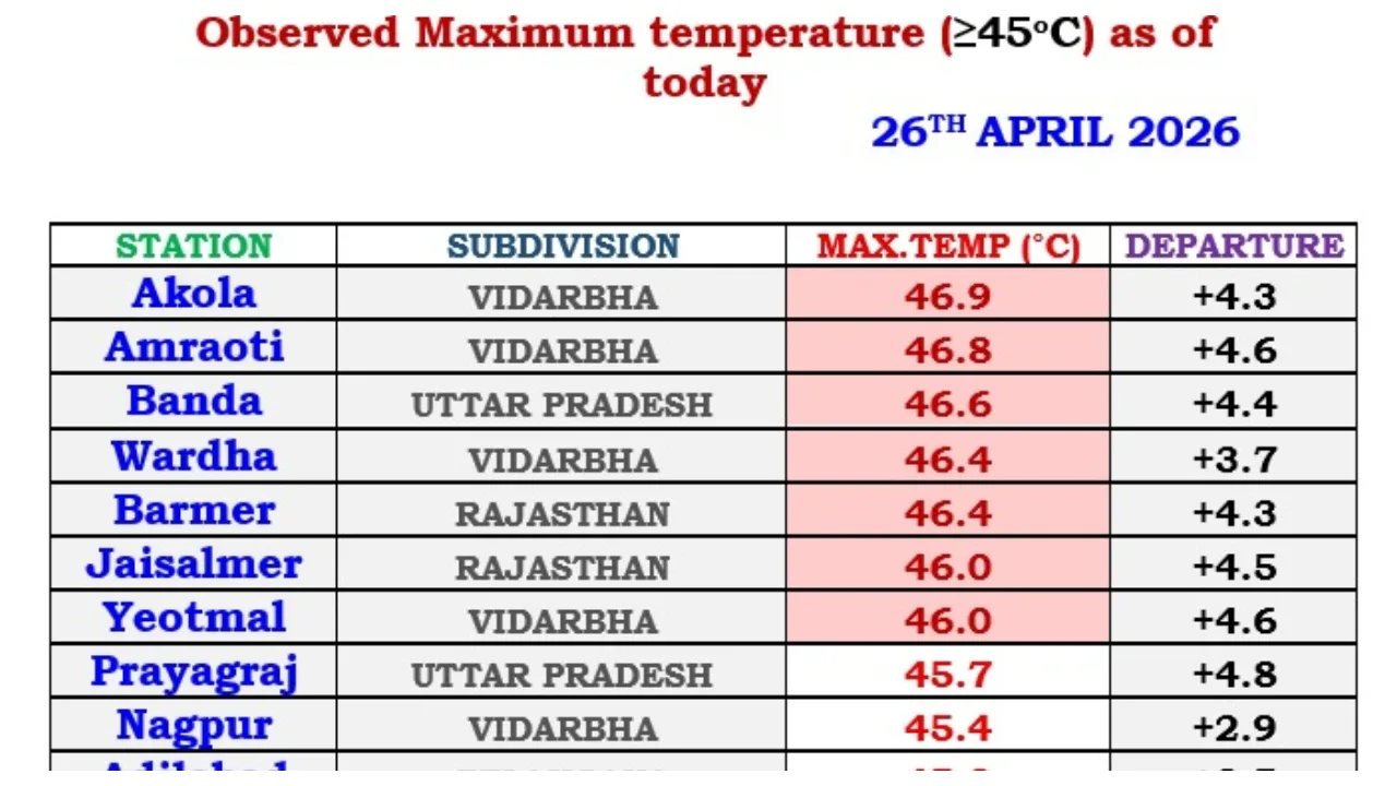 - Highest Temperature Recorded: 46.9°C in Akola, Vidarbha