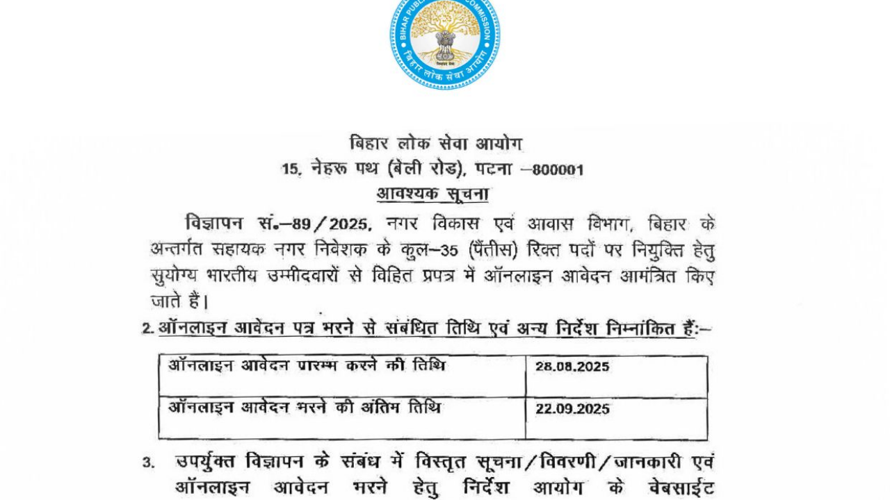 Here we are giving important information like required qualification, application fee. Bihar Public Service Commission (BPSC) has issued Advertisement No. 89/2025, under which online applications have been invited by Bihar Public Service Commission for appointment to a total of 35 vacant posts of Assistant Town Planner under Urban Development and Housing Department, Bihar.