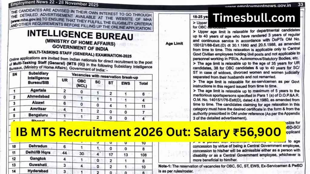 Sarkari Naukri. The Intelligence Bureau (IB) has announced the online application process for the Multitasking Staff (MTS) Recruitment 2026. This
