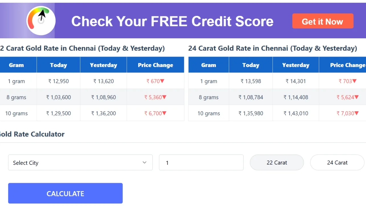 In Kolkata, the capital of West Bengal, the rate for 22-carat gold dropped by ₹5,450, settling at ₹129,850 per tola. Here, the 24-carat rate decreased by ₹5,730, standing at ₹136,340 per 10 grams. On the previous day, the price of 22-carat gold was ₹135,300 per tola, and the rate for 24-carat gold was ₹142,070 per tola. In Hyderabad, the capital of Telangana, the rate for 22-carat gold dropped by ₹6,700 to stand at ₹129,500 per 10 grams. The price of 24-carat gold declined by ₹7,030, reaching a total of ₹135,980 per tola. Just a day earlier, on Monday, 22-carat gold was priced at ₹136,200, and 24-carat gold was trading at ₹143,010 per 10 grams.