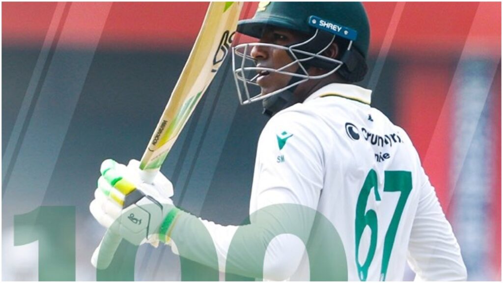 South African all-rounder Senuran Muthusamy scored his maiden Test century against India at the Barsapara Stadium in Guwahati on Sunday.