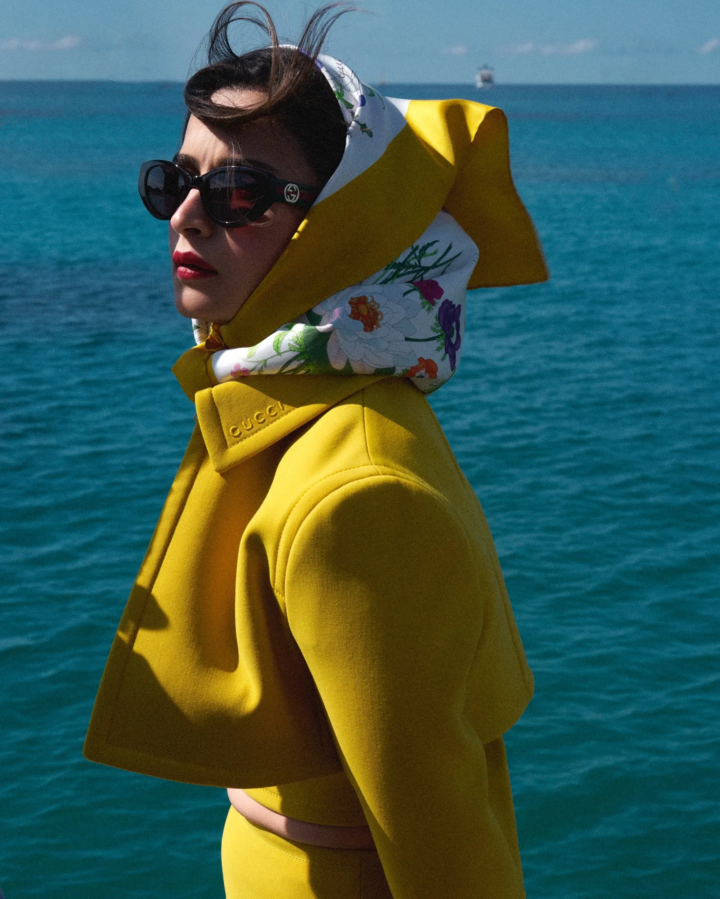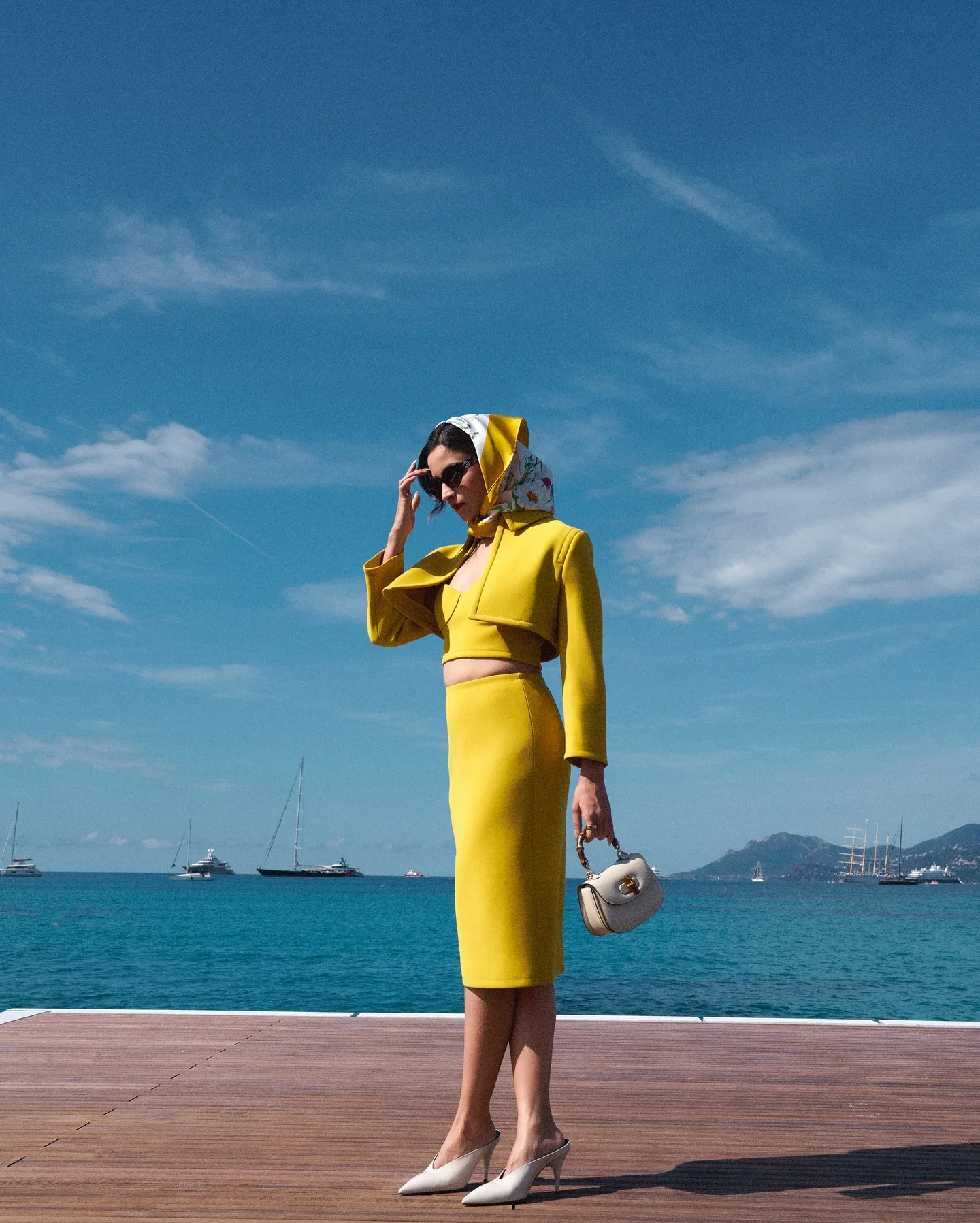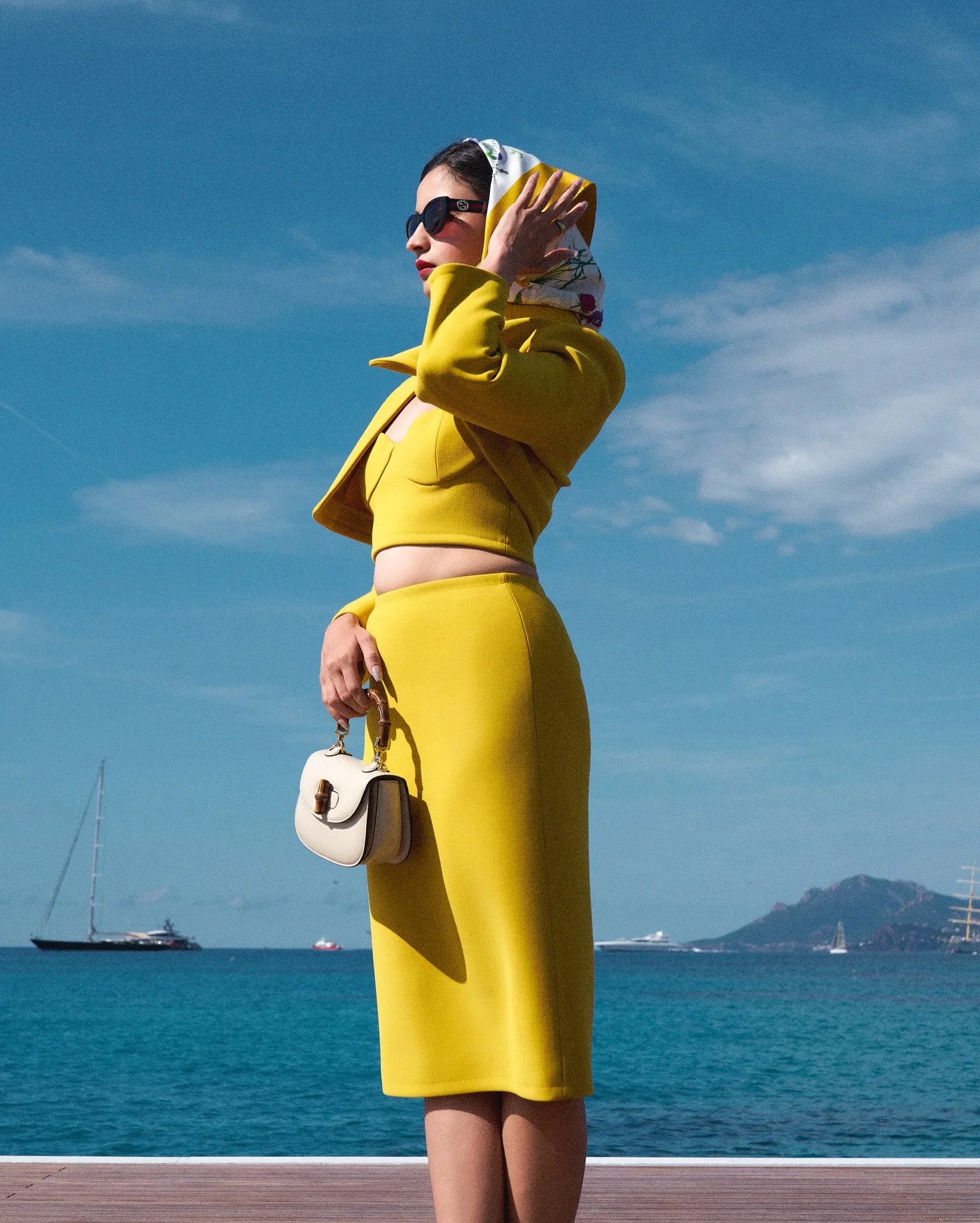 Alia Bhatt looks very attractive in a yellow skirt-top set and white floral scarf in the photo.