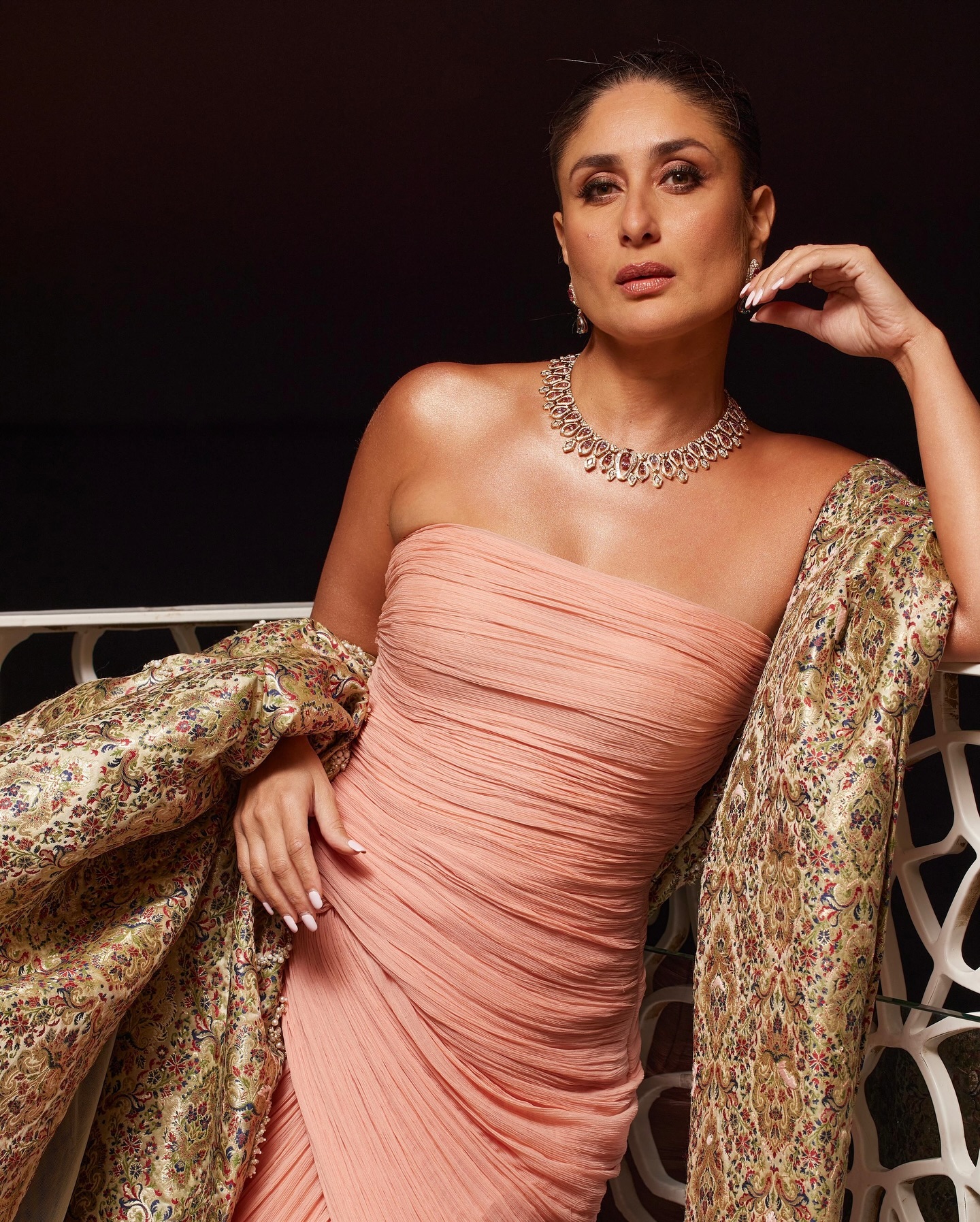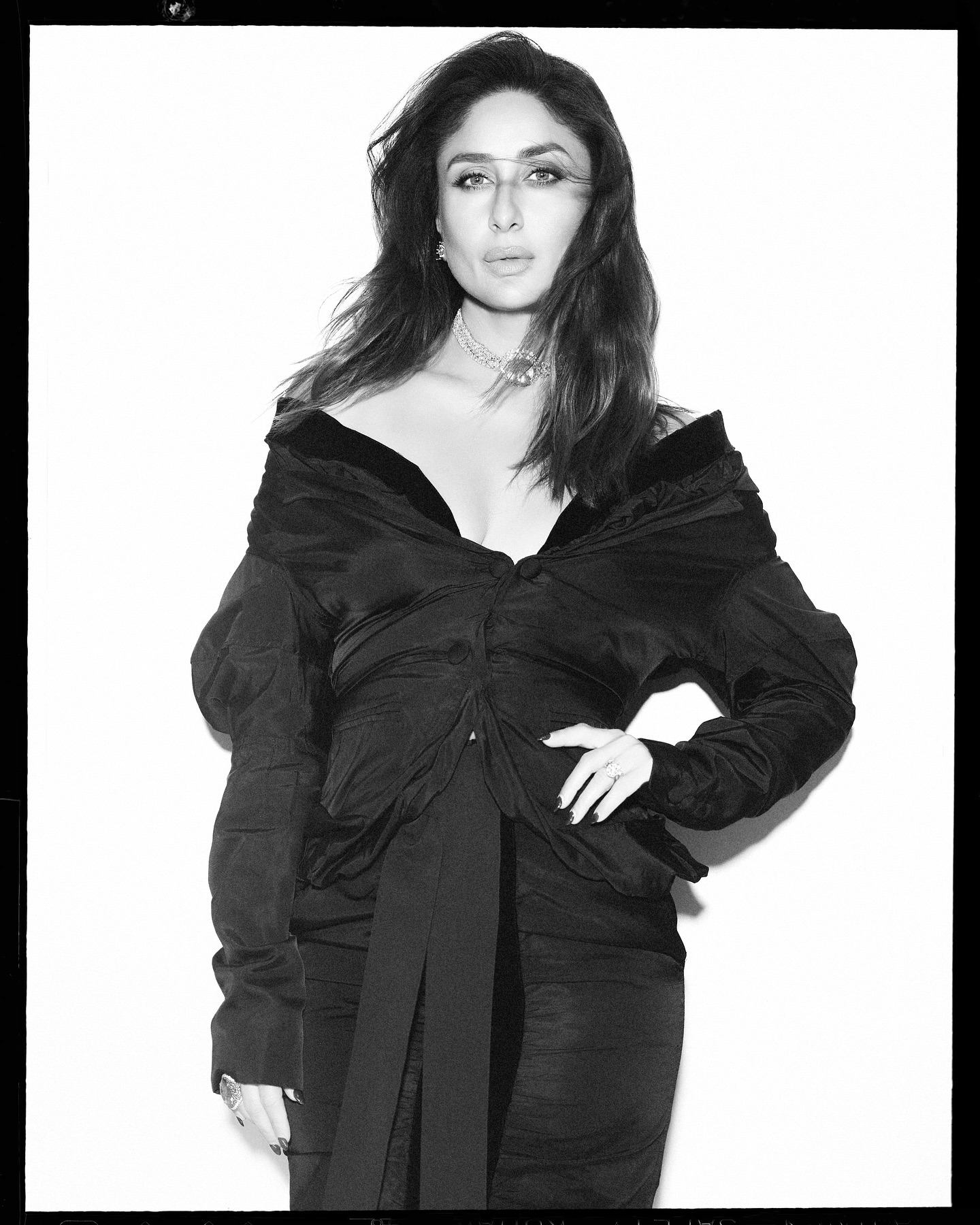 Kareena has completed her look with a backless blouse, choker necklace and nude makeup.