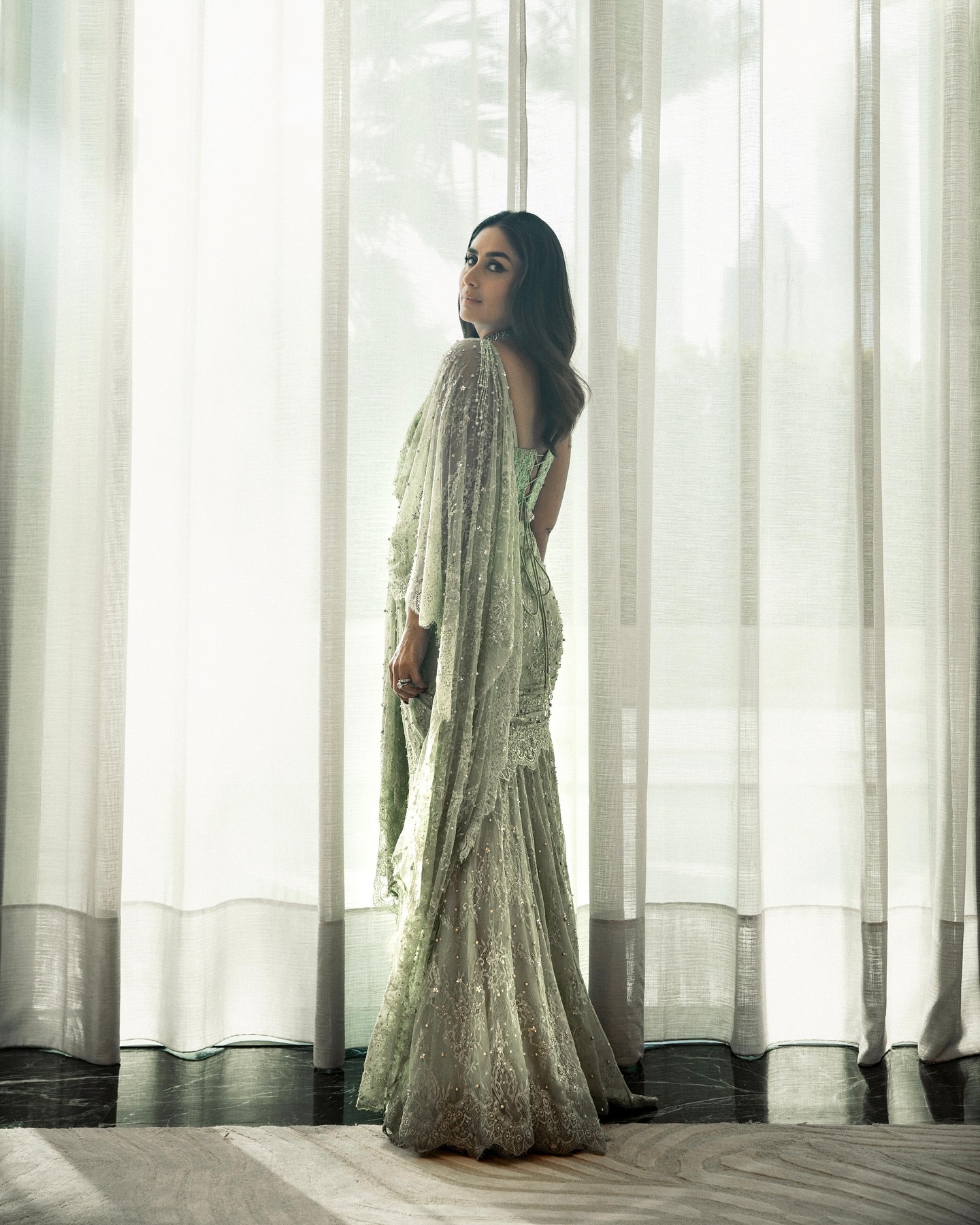 In this photo, Kareena is wearing a pastel green net saree.