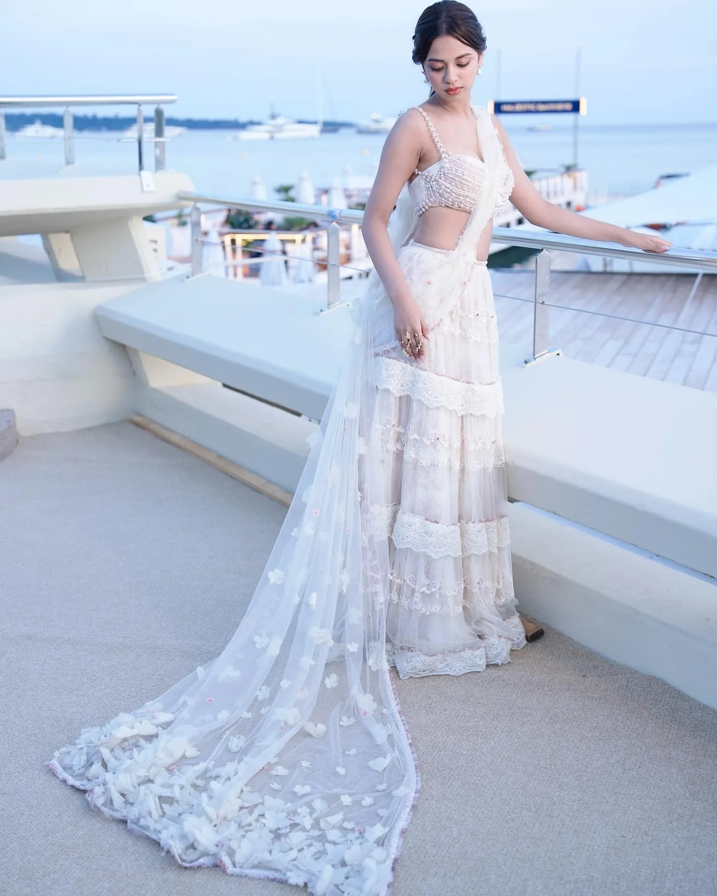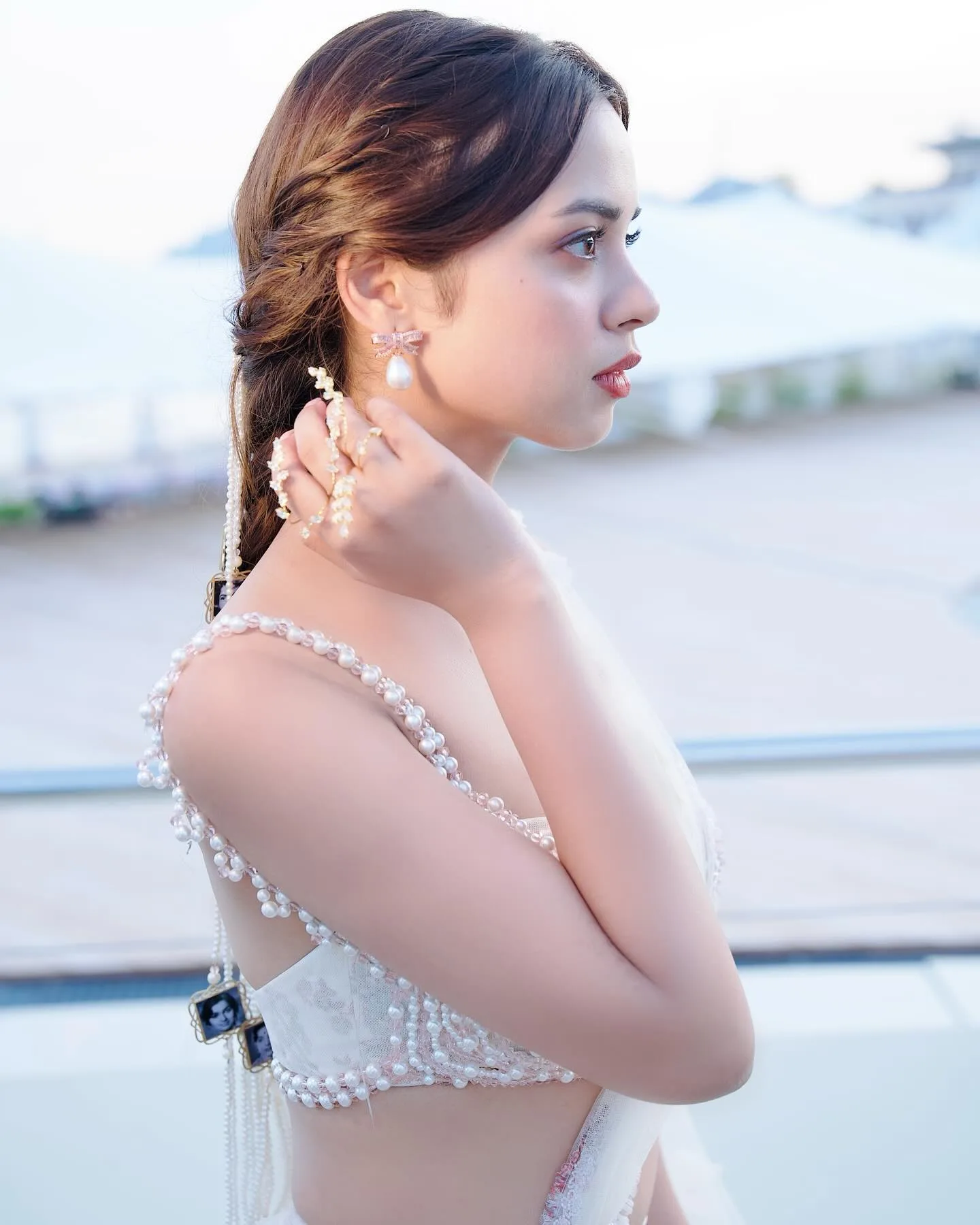 Missing Ladies fame Nitanshi wore a white colored outfit with pearls attached to the backless blouse.