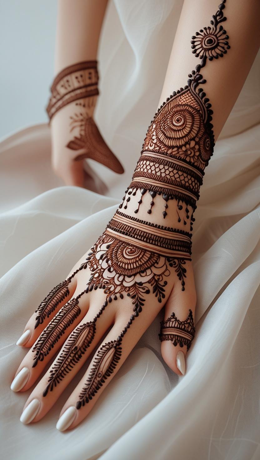 अगर आपको भरी हुई मेहंदी पसंद नहीं है तो पैरों पर बेल-बूटे वाली डिज़ाइन बनवा सकती हैं। इसमें आप पैरों के आगे की तरफ फूलों और पत्तियों की एक सुंदर बेल बनवा सकती हैं। यह डिज़ाइन पैरों को एक क्लासी और एलिगेंट लुक देती है। साथ ही नेल पॉलिश लगाना न भूलें, यह आपके पैरों को और भी आकर्षक बना देगा।