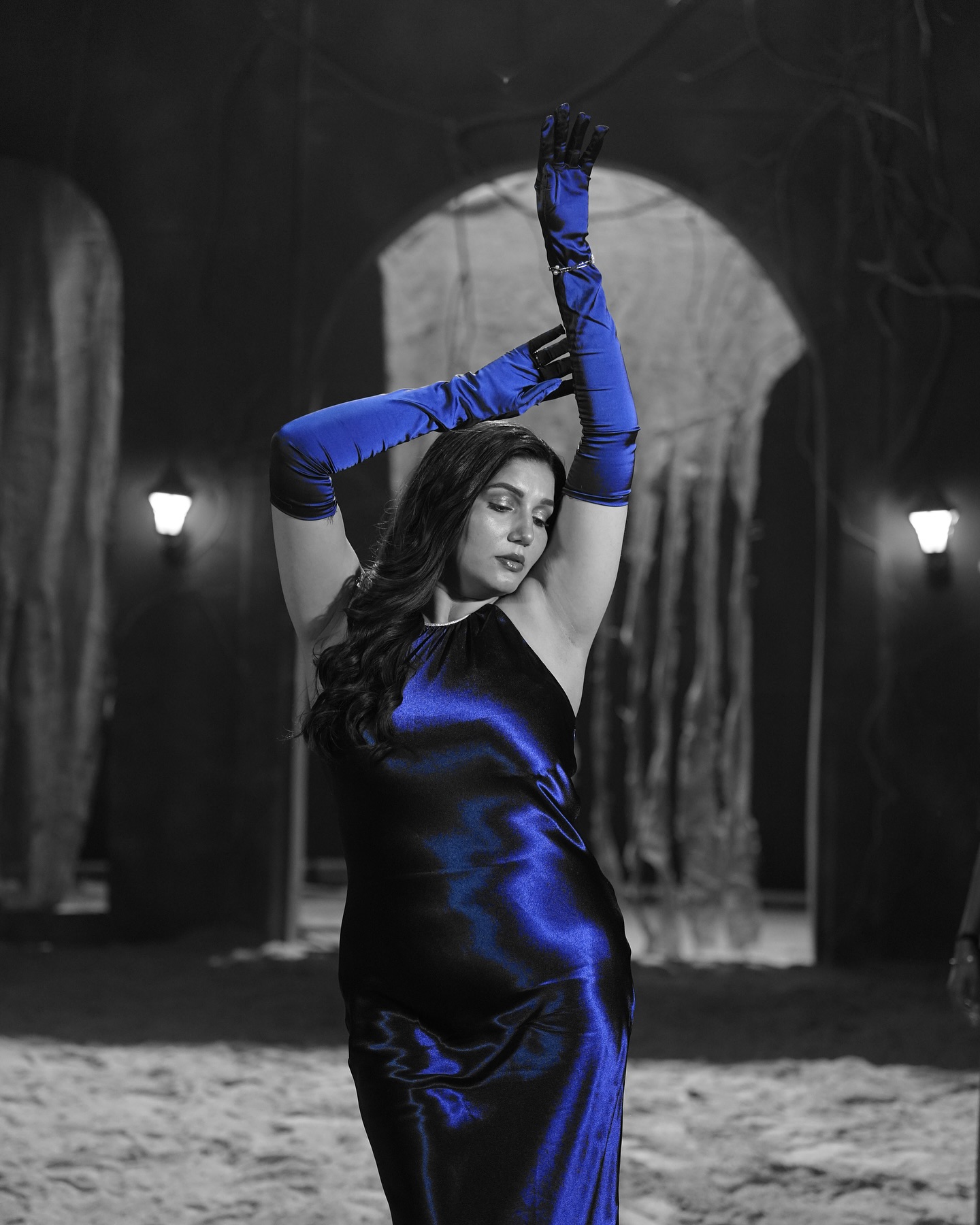 Sapna is wearing a blue colored silk bodycon gown.