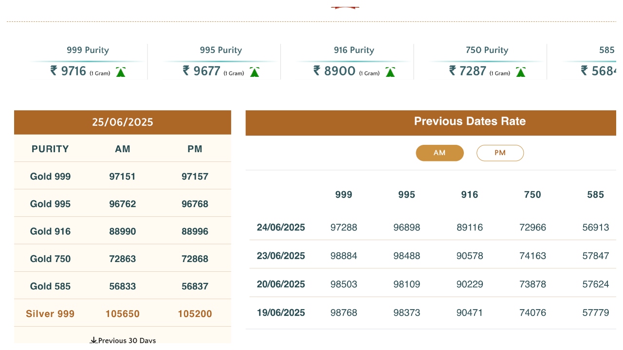 According to the India Bullion and Jewellers Association, the price of 995 purity gold was Rs 96762 per 10 grams this morning, which has now increased to Rs 96768 per 10 grams. At the same time, the price of 916 (22-carat) purity gold has reached Rs 89,896 this evening. Apart from this, the price of 750 (18 carat) purity gold was Rs 72863 per 10 grams in the morning; now it has increased to Rs 72868 per tola in the evening. At the same time, the price of 585 (14-carat) purity gold is Rs 56,837 per 10 grams. At the same time, the price of 999 purity silver was Rs 105650 per kilogram in the morning, and now, after decreasing in the evening, it has reached Rs 105200.