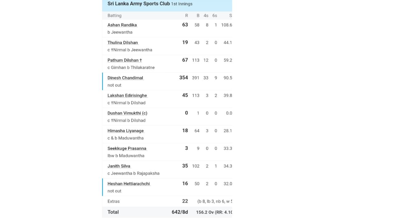 The match was played at the Katunayake Sports Complex over three days, from August 25 to 27, 2020, between the Sri Lanka Army Sports Club and Saracens Sports Club. Although the match ended in a draw, Chandimal’s innings became the definitive talking point. The Sri Lanka Army batted first, declaring their innings at 642 for 8. Dinesh Chandimal was the main contributor with 354 runs. Pathum Dilshan contributed with 67 runs, while Ashan Randika scored 63 runs.