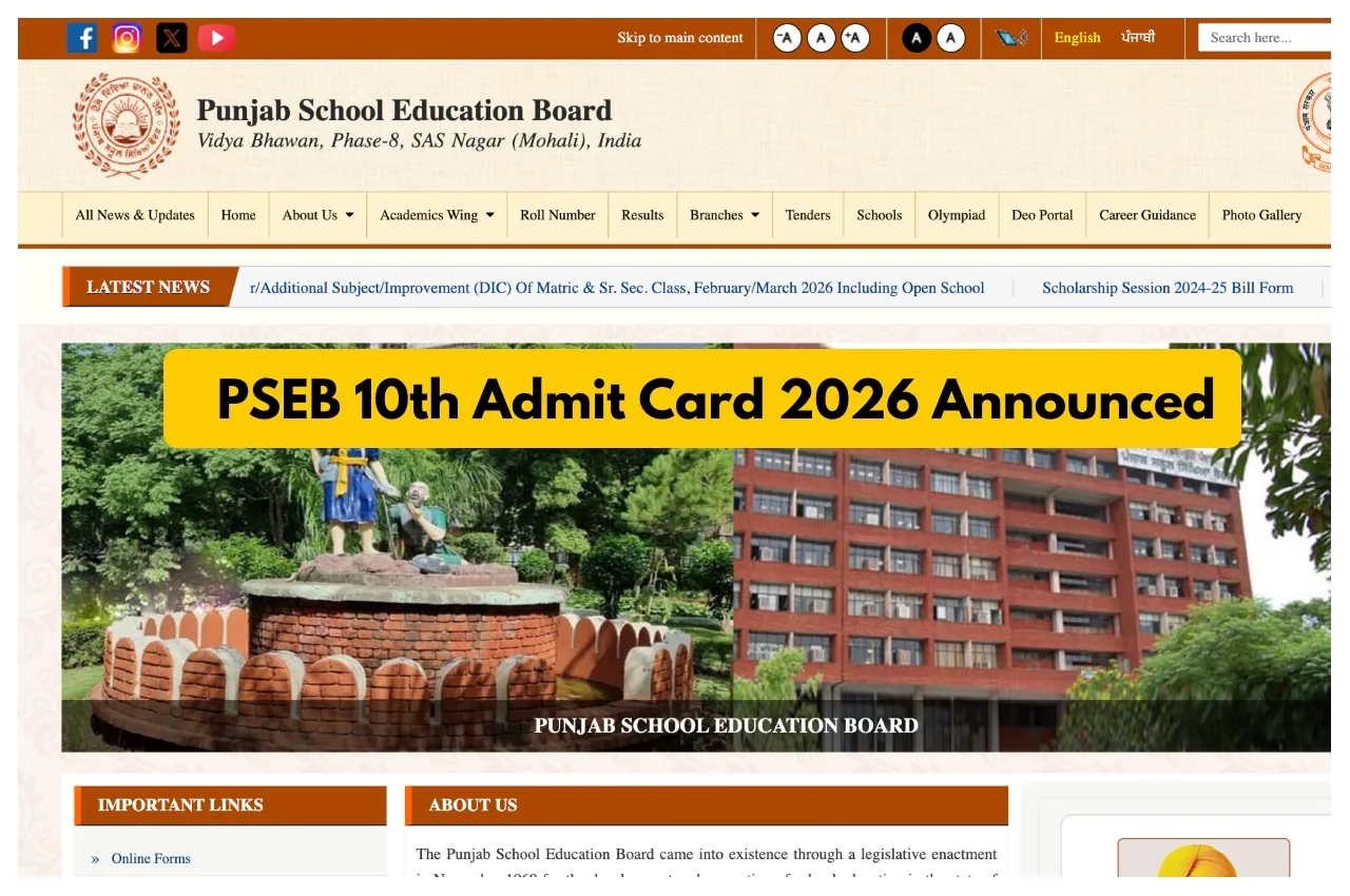 PSEB Punjab Board 10th Admit Card 2026 Released: The Punjab Board has released the admit cards for Class 10 students.